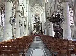 Die eigenartige Lichtführung in dieser Kirche, vor allem am späten Nachmittag, entsteht durch die modernen, ebenfalls von Jan Lauwers entworfenen Glasmalereien[2], welche die 1945 zerstörten Fenster aus dem 19. Jahrhundert ersetzen.