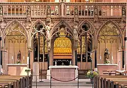 Der Stiftschor, der vom Chorhaupt aus gemessen länger als das eigentliche Langhaus ist, wird durch einen filigranen Lettner aus der Erbauungszeit abgeschlossen, mit offenem Maßwerk und zwei (von ursprünglich sechs) Statuetten in den Zwickeln. Der Hochaltar, der wahrscheinlich bereits bei der Chorweihe 1331 fertig war, ist eine Miniaturwiedergabe gotischer Portalskulptur (nach dem Diebstahl der Altarfiguren 1975 sind inzwischen die meisten wieder zurückgekehrt). Ein um 1340 entstandenes Kruzifix aus Eichenholz wurde zusammen mit anderen Figuren bereits im späten 19. Jahrhundert vom Hochaltar gestohlen und gelangte in das Mainzer Altertums-Museum, heute Landesmuseum Mainz.[5] Die „Architektur“ des Altarschreins erinnert mit ihrem Maßwerk und den Rosetten an die Südfassade der Katharinenkirche zu Oppenheim. Im 17. Jahrhundert wurde der Altar mit einem barocken Aufsatz versehen, der Ende des 19. Jahrhunderts durch ein bis heute vorhandenes, neugotisches Gesprenge ersetzt wurde, ursprünglich besaß der Schrein keinerlei Aufsatz.[6]