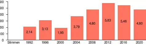 Jahr Stimmenanteil (%) Platzierung Sitze Platzierung Regierungsbeteiligung