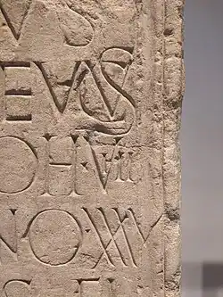 - ↑ Manfred G. Schmidt: Lateinische Epigraphik. Eine Einführung. 3. Auflage, Wissenschaftliche Buchgesellschaft, Darmstadt 2015, ISBN 978-3-534-26755-2, S. 21.