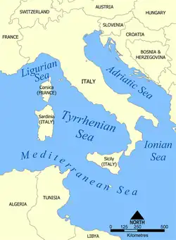 Das Ligurische Meer wird im Norden von der Küste der Riviera in Italien sowie von Monaco begrenzt. Im Süden begrenzt die zu Frankreich gehörende Insel Korsika das Meer. Die Entfernung von Monaco bis zur nördlichen Spitze von Korsika, dem Cap Corse beträgt rund 160 Kilometer.[1] Die Südostgrenze zum Tyrrhenischen Meer ist eine gedachte Linie vom Cap Corse (9°23'E) nach Tinetto (44°01′N 9°51′E), durch die Inseln Tino und Palmaria bis zum San-Pietro-Punkt (44°03′N 9°50′E) am nördlichen Rand der Apenninhalbinsel.[2]