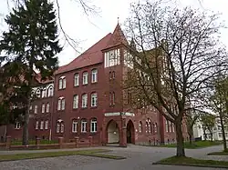 Das 1904 gebaute, dreigeschossige verklinkerte L-förmige Gebäude mit seinem viergeschossigen eckbetonten Uhrenturm, den zwei mächtigen Seitenrisaliten an der Ost- und Westseite als Treppengiebel mit acht bzw. neun Fialen sowie dem südlichen Zwerchgiebel mit einem Krüppelwalmdach ist denkmalgeschützt.
