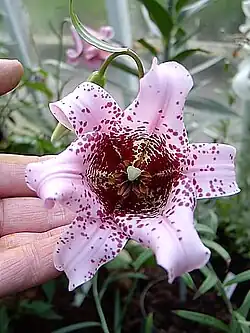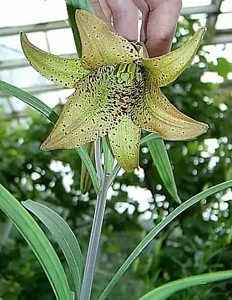 Sie blüht von Juni bis September mit einer bis zu sechs nickenden oder waagerechten, glockenförmigen Blüten, die duften. Die zwittrigen Blüten sind dreizählig. Die äußeren Blütenhüllblätter sind lanzettförmig die inneren etwas breiter und 6,5 cm bis 8,3 cm lang sowie zwischen 14 mm und 18 mm breit. Die Grundfarbe der Blüten ist weiß, grünlich, rosa, gelb oder purpurn oft mit purpurnen oder roten Punkten. Die Antheren sind etwa 16 mm groß und die Filamente etwa 30 mm lang. Der Griffel ist 22 mm bis 26 mm lang und die Nektarien sind nicht papillös, der Fruchtknoten ist etwa 2 bis 4 mm breit und 17 bis 20 mm lang. Die Staubblätter neigen zusammen. Die Samen reifen in 25 mm bis 35 mm langen länglich ovalen Samenkapseln heran.