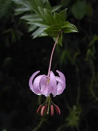 Die Pflanze blüht von Juni bis August mit zwei bis zehn in einer Rispe nickender Blüten, selten mit einer einzelnen Blüte. Die zwittrigen Blüten sind dreizählig. Die sechs gleichgestalteten Blütenhüllblätter (Tepalen) sind stark zurückgebogen (Türkenbundform) und 4,5 bis 6 cm lang sowie zwischen 8 mm und 10 mm breit. Die Grundfarbe der Blüten ist blass purpurn-rot oder pink, mit dunklen purpurnen Punkten. Die Ränder der Blütenblätter rollen sich. Die Antheren sind purpurn, die Pollen sind purpurrot und die Filamente sind ebenfalls purpurn und 4 cm bis 4,5 cm lang. Die Nektarien sind weder papillös noch fransig. Die Samen reifen im August zu einer ovalen, etwa 2 cm großen Samenkapseln heran und keimen sofortig-epigäisch.
