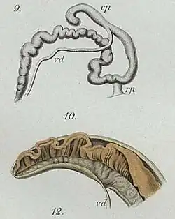 Im Genitalapparat erreicht der Penis im Adultstadium ungefähr ⅔ der Körperlänge. Bei juvenilen Exemplaren ist er noch kürzer (im Verhältnis zur Körperlänge). Der Penis ist in sich verdreht mit einem blinden, hakenförmig gekrümmten und sich allmählich verjüngendem Ende. Dieses blinde Ende kann jedoch bei konservierten Exemplaren oder bei der Präparation noch innen umgestülpt sein; das blinde Ende scheint in solchen Exemplaren zu fehlen und kann zur Verwechslung mit anderen Arten führen. Der Retraktormuskel setzt ungefähr auf 1/7 der Penislänge (vom Ende gesehen) an. Der Samenleiter mündet in den Penis deutlich weiter dem blinden Ende zu. Die Längsfalte im Penis beginnt bereits im blinden Ende.