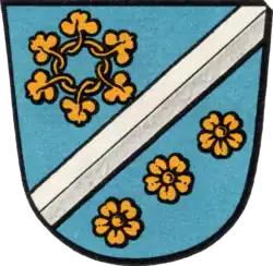 Das Wappen besteht aus einem blauen Schild, der durch einen schrägen Silberbalken von rechts oben nach links unten geteilt wird. In der oberen Hälfte ist ein goldener Blätterkranz abgebildet, in der unteren Hälfte befinden sich drei goldene Blüten.