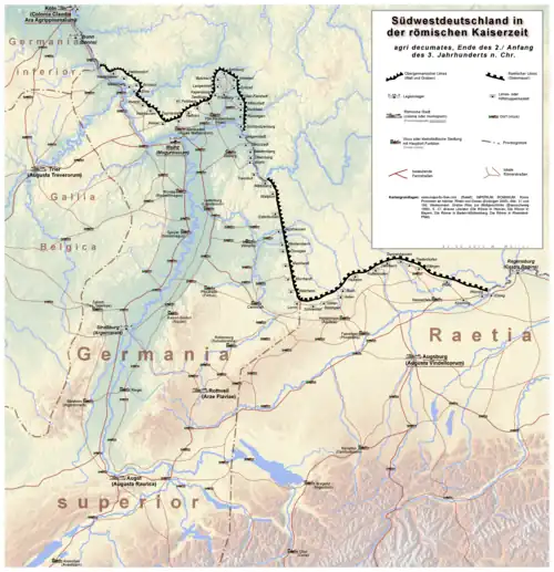 Zu Beginn des 3. Jahrhunderts erhielten zahlreiche rechtsrheinische Civitas-Hauptorte Stadtmauern: Nida-Heddernheim, Dieburg, Lopodunum (Ladenburg), Bad Wimpfen, Sumelocenna (Rottenburg am Neckar), und Arae Flaviae (Rottweil).[36] Ausnahmen bildeten Aquae Mattiacorum (Wiesbaden) und Aquae (Baden-Baden), wo man möglicherweise auf die Nähe zum Rhein und auf die dort stationierten Legionen vertraute.