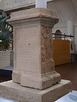 43 Blöcke des Dativius-Victor-Bogens wurden zwischen 1898 und 1911 als Spolien in der mittelalterlichen Mainzer Stadtmauer gefunden. Der 6,50 Meter hohe und 4,55 Meter breite Bogen gilt als Ehrenbogen, auch wenn er ursprünglich nicht frei stand, sondern Teil einer Portikus war, die in der Inschrift auf der Frontseite der Attika genannt wird.[82] Daraus geht hervor, dass der Ratsherr Dativius Victor aus der Civitas Taunensium (Nida) den Mainzer Bürgern den Bogen mit Portikus versprochen hatte. Die Frontseite der Archivolte ist mit einem teilweise erhaltenen Zodiakus (Tierkreis) dekoriert, der Schlussstein zeigt Jupiter und Juno. In der Fläche über der Archivolte sind Opferszenen mit zwei Jahreszeitengenii dargestellt. Das nicht weiter geteilte Bildfeld wird von einem in eine Toga gehüllten Priester dominiert, möglicherweise dem Stifter selbst bei der Ausübung seines Priesteramtes.