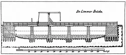 Die Limmer Brücke war etwa 130 Fuß lang. Auf gemauerten Brückenköpfen an den beiden Ufern und Stützen in der Leine war die Holzbohlenbrücke in fünf Segmente geteilt. Das zweite davon konnte als Zugbrücke geöffnet werden, um Schiffe durchfahren zu lassen.[2] Im Kriegsfall konnte die Brücke durch das Entfernen der Holzbohlen unpassierbar gemacht werden.[3] Unter der Brücke verliefen auf dem Flussgrund verlegte Bleirohre. Sie waren ein Teilabschnitt der ansonsten hölzernen Wasserleitungen vom Dieckborn im Küchengarten und von den Badebornteichen zu den Wasserhochbehältern für den Großen Garten.[2] Je nach ihrem Anstrich hieß die Limmer Brücke zunächst auch „Rote Brücke“ und später „Weiße Brücke“.[4]