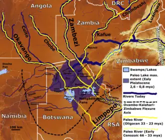 Vor etwa 65 Millionen Jahren mündete der Sambesi nicht in die Straße von Mosambik. Er floss parallel zum Cuando und zu Okavango und mündete wie diese in den Limpopo. Dabei benutzte der Sambesi das Flussbett des Shashe, und der Cuando das des Motloutse.[13]
