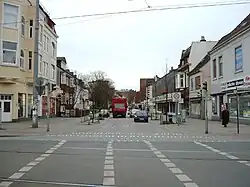 An der Straße stehen überwiegend zwei- bis viergeschossige Gebäude.