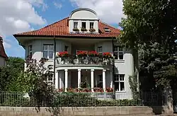 Die zweigeschossige, verputzte Villa entstand in der Zeit zwischen 1925 und 1930. Markant für das Erscheinungsbild des Hauses ist der straßenseitig befindliche halbrunde Balkon, der von Säulen gestützt wird. Das Balkongitter ist im Stil des Art déco gehalten. Über diesem mittig angeordneten großen Balkon befindet sich eine mit drei Fenstern versehene Dachgaupe, die über einen eigenen Ziergiebel verfügt. An den Gebäudeseiten befinden sich gewölbt wirkende Seitenrisalite. Bedeckt ist das Haus mit einem Walmdach.