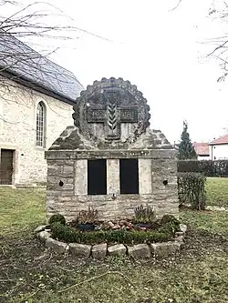 - Kriegerdenkmal (1914–1918) mit einem verbauten Waidstein vor der Kirche.