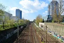 westlich des Tunnels; Blick nach Westen Richtung Bahnhof Warszawa Zachodnia Das hier offen geführte Trassenteilstück westlich des Tunnels; Blick nach Westen Richtung Bahnhof Warszawa Zachodnia | |