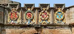 Der Besucher nähert sich der Anlage von Süden und muss zuerst ein vorgelagertes Außentor passieren. Es zeigt über der spitzbogigen Tordurchfahrt die Wappen der vier Ritterorden, denen der Erbauer Jakob V. angehörte. Das Strumpfband symbolisiert den englischen Hosenbandorden, während die Distel für den schottischen Orden von der Distel steht. Das dritte Wappen steht als Symbol für den burgundischen Orden vom Goldenen Vlies, und die Lilien des vierten Wappens versinnbildlichen den französischen Michaelsorden. Die steinernen Wappenschilde sind jedoch nicht mehr die Originale aus dem 16. Jahrhundert, sondern Repliken von 1845.[34] Hinter dem äußeren Tor liegt ein Vorhof, in dem früher Ställe und Wirtschaftsbauten standen und der heute als Parkplatz genutzt wird.[19] Auffälligstes Element der zum Parkplatz gelegenen südlichen Außenfassade von Linlithgow Palace sind die hohen Rundbogenfenster mit profiliertem Gewände und gotischem Maßwerk. Sie kennzeichnen die Lage der einstigen Schlosskapelle im ersten Obergeschoss. In deren Inneren befinden sich zwischen den Kapellfenstern Nischen, in denen früher Statuen standen. Ihre Konsolsteine sind noch erhalten und zeigen Reliefs von Engeln, die auf einem Instrument spielen. Im überwölbten Erdgeschoss des Südflügels befand sich unter der Kapelle einst eine Backstube.[35]
