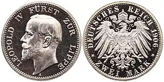 In der Münze Berlin (Münzstättenzeichen = „A“) wurden von 1843 bis 1913 die Reichsmünzen, die auch in Lippe Gültigkeit besaßen, geprägt, unter anderem die 1875 im ganzen Kaiserreich eingeführte Goldmark. Die Vorderseite, das Avers, konnte von den Gliedstaaten des Reiches gestaltet werden. In Lippe zeigten sie das Porträt des regierenden Fürsten.