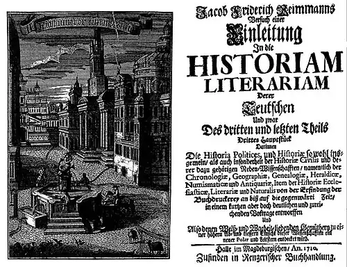 - Jacob Friedrich Reimmann: Versuch einer Einleitung in die Historiam Literariam. Rengerische Buchhandlung, Halle 1708.