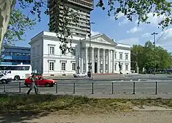 Nach längeren Diskussionen, ob das zerstörte Gebäude originalgetreu wiedererrichtet werden oder ob ein moderner Neubau entstehen sollte[2], begann im Jahr 2003 der historische Wiederaufbau nach Plänen des Architekten Christoph Mäckler. Im Oktober 2005 war die Bauphase abgeschlossen. Seitdem ist die Alte Stadtbibliothek Sitz des Literaturhauses Frankfurt. Nachdem das Gebäude der Alten Stadtbibliothek wiedererrichtet und durch das Literaturhaus bezogen worden war, übersiedelte der Portikus in einen von dem Frankfurter Architekten Christoph Mäckler geplanten und von der Stiftung Giersch finanzierten Neubau auf der Maininsel.