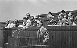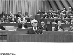 - ↑ Der Bericht ist hier nachzulesen: Erich Honecker (Berichterstatter): X. Parteitag der SED vom 11. bis 16. April 1981 in Berlin: Bericht des Zentralkomitees der Sozialistischen Einheitspartei Deutschlands an den X. Parteitag der SED. Dietz, Berlin 1981, S. 104 (online).