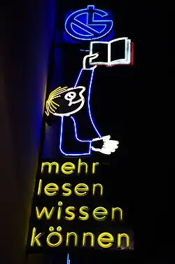 Die jährliche Produktion der DDR-Verlage umfasste regelmäßig über 6000 Titel mit einer Gesamtauflage von etwa 150 Millionen Büchern, sodass die Durchschnittsauflage annähernd 25.000 Exemplare betrug. Damit stand die DDR in der Buchproduktion pro Kopf neben der Sowjetunion und Japan an der Weltspitze. Auf jeden DDR-Bürger kamen damit pro Jahr acht bis neun neu produzierte Bücher.[36] Als Hauptverteiler der Buchproduktion fungierte der 1962 verstaatlichte Leipziger Kommissions- und Großbuchhandel (LKG).[37] Seit 1952 wurde die Auszeichnung Schönste Bücher der DDR für gelungene Buchgestaltung verliehen.