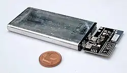 Das Bild zeigt einen Lithium-Polymer-Akku mit einer Nennspannung von 3,6 V. Der Akku ist in die Abdeckung eines Mobiltelefons integriert. Nach Entfernen der Plastikummantelung liegt rechts im Bild die elektrische Schaltung des Batterie-Management-Systems. Im Deckel des Alublocks ist eine elektrische Sicherung gegen Überlastung integriert. Der Alublock schützt die drei Folien des Lithium-Polymers, die im unteren Bild herausgezogen wurden.