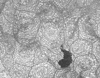 Die Columella, die zentrale Karbonatsäule der einzelnen Koralliten, ist lattenförmig und steht in Kontakt mit dem Gegenseptum. Die Großsepten sind gewöhnlich mit der Columella verbunden. Die Kleinsepten reichen bis zum inneren Rand des Dissepimentariums, der äußeren Zone des Koralliten mit blasenförmigen Skelettelementen (Dissepimente) oder gerade noch in die äußeren Bereiche des Tabulariums, des zentralen Bereichs mit Zwischenböden (Tabulae). Das Dissepimentarium kann unterschiedlich stark ausgeprägt sein, besteht in der Regel aber aus einfachen Dissepimenten zwischen den Septen und nur gelegentlich aus lonsdaleoiden Dissepimenten, die über den Abstand benachbarter Septen hinausreichen. Die Tabulae sind unvollständig, außen horizontal oder in Richtung zum Dissepimentarium geneigt und im Zentrum des Koralliten konisch aufgewölbt.[8]