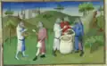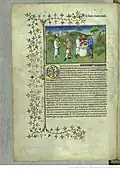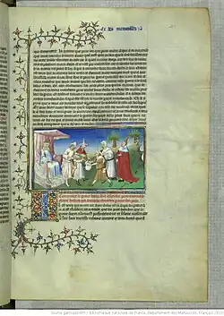 Später, 1413, schenkte Johann Ohnefurcht das Manuskript seinem Onkel Jean Duc du Berry, dessen Wappen auf den Folios 1, 97, 136v, 226 und 268 erscheint. Inventare aus den Jahren 1413 und 1416 aus der persönlichen Bibliothek des Herzogs von Berry bestätigen, dass das Manuskript bis zu seinem Tod in seinem Besitz blieb.