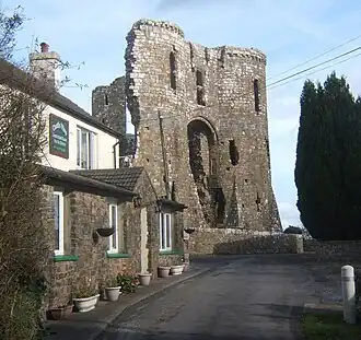 ![]() Das Torhaus der Burg vom Dorf aus gesehen | ||
