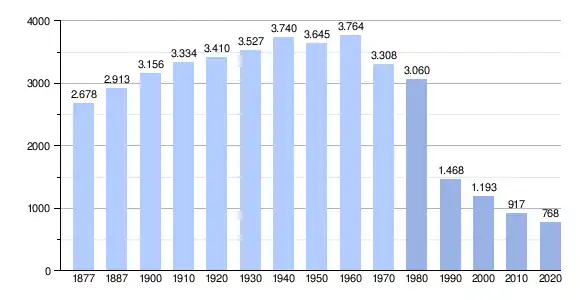 Durch Fortzug in die umliegenden Städte ist die Bevölkerung seit den 1950er Jahren stetig gesunken.