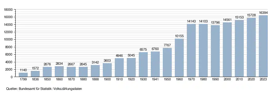 - ↑ a b Daten der Eidgenössischen Volkszählungen ab 1850 nach Gemeinden. (XLSX; 10 MB) Bundesamt für Statistik, Neuchâtel, 12. Juli 2024, abgerufen am 15. April 2025 (Öffnung in Excel nur über "Anhang/Excel-Datensatz" möglich).