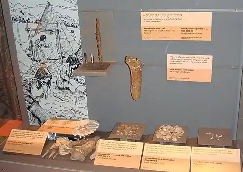 Geweihstangen von Rotwild (5.240 bis 4.600 Jahre vor heute) waren zu Grabwerkzeugen hergerichtet worden. In den Küchenabfallhaufen finden sich Muschelschalen von Austern, Kammmuscheln, Napfschnecken und Krabbenscheren (7.500 bis 4.000 Jahre vor heute). An Knochenfunden sind zu erwähnen Rothirsch (Cervus elephas), Reh (Capreolus capreolus) und Schwein (Sus scrofa).