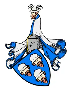 Das Stammwappen zeigt in Blau drei (2:1) bärtige Mannsköpfe mit silbernen Eisenhüten (Tatarenhut). Auf dem Helm ein Mannesrumpf mit blau-silbern gespaltener Kleidung und silber-blauem Kragen. Der Eisenhut auf dem bärtigen Haupt ist auf beiden Seiten mit je drei schwarzen Hahnenfedern besteckt. Die Helmdecken sind blau-silbern.