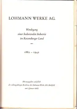 - Lohmann Werke AG. Werdegang einer bedeutenden Industrie im Ravensberger Land. Hrsg. anlässlich des sechzigjährigen Bestehens der Lohmann Werke AG. Bielefeld am 1. Januar 1942 (Titelaufnahme bei Stadtarchiv und Landesgeschichtlicher Bibliothek Bielefeld).