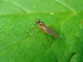 Die Fliegen erreichen eine Körperlänge von 2,0 bis 3,0 Millimetern. Ihr Körper ist schlank und zylinderförmig. Am Thorax und Hinterleib verläuft am Rücken mittig ein dunkler Streifen. Die posterodorsale Borste auf den Schienen (Tibien) der mittleren Beine ist merklich kürzer als die Dorsalborste. Auf den Tibien der Vorderbeine befindet sich je eine Dorsalborste im basalen und eine im apikalen Drittel. Dort sind keine posterodorsalen Borsten ausgebildet. Die Art kann nur sicher anhand von genitalmorphologischen Untersuchungen bestimmt werden.