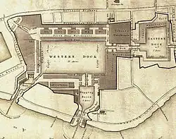Die London Docks waren eine von vielen Hafenanlagen im historischen Londoner Hafen. Sie wurden 1799–1815 in Wapping flussabwärts vom Londoner Stadtzentrum gebaut und kosteten mehr als £ 5½ Mio.[1] Früher legten die Schiffe an den Uferkais der Themse an, aber in dieser Zeit wurden mehr Liegeplätze gebraucht. Die London Docks waren die dem Stadtzentrum am nächsten gelegenen Hafenbecken, bis zwei Dekaden später die St. Katharine Docks entstanden.