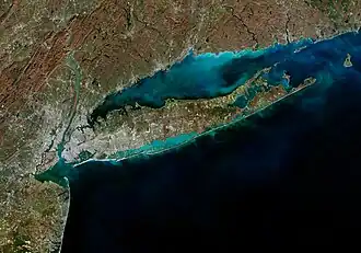 Die Insel in Downstate New York erstreckt sich von den Häfen der Stadt New York in den nördlichen Atlantik. Im Norden liegt der Long Island Sound, der die Insel von Connecticut und Rhode Island trennt. Im Süden liegen die Great South Bay und die Jamaica Bay; kleinere Inseln umgeben die Küstenlinie. Etwas östlich von der Mitte befindet sich das Quogue Wildlife Refuge (QWR)[5][6] mit der angrenzenden Quantuck Bay (zum Ozean hin).[7]