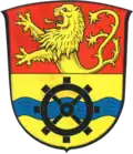 Blasonierung: „Geteilt, oben in Rot ein wachsender, doppelschwänziger, goldener Löwe; unten in Gold ein blauer Wellenbalken, überschnitten von einem schwarzen Mühlrad.“