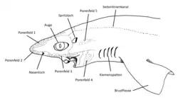 Beim Dornhai (Squalus acanthias) liegen fünf Ampullenfelder am Kopf vor. Das große Rezeptorfeld auf der Stirn des Dornhais wird durch den dorsal verlaufenden Ramus superficialis ophthalmicus innerviert. Die Porenfelder an der Unterseite der Schnauze und seitlich unter dem Auge werden durch den Ramus buccalis innerviert. Der hinter dem Spritzloch verlaufende Ramus mandibularis innerviert schließlich das zwischen Kiemen und Mund gelegene Porenfeld sowie das zwischen Spritzloch und Kiemen.[7][1]