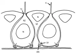 Die birnenförmigen Rezeptorzellen in den Lorenzinischen Ampullen der Knorpelfische besitzen einen zentralen Zellkern und ein einzelnes Kinocilium an der oberen (apikalen) Zellseite, welches in das Ampullen-Lumen ragt. Das Kinocilium weist dabei eine einzigartige Struktur aus 8 + 1 Mikrotubuli im Schaft und 9 + 0 Mikrotubuli an der Basis auf. Jede Rezeptorzelle ist von Stützzellen umgeben.[9][6][10]