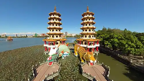 Am südwestlichen Ende des Sees liegen die zwischen 1974 und 1976 erbauten Drachen-und-Tiger-Pagoden, zwei pagodenähnliche Türme, die ihren Namen von ihren als Drache bzw. Tiger gestalteten Eingängen haben. Es ist Sitte, den Komplex durch das Maul des Drachen zu betreten und durch das Maul des Tigers zu verlassen. In der Drachen-Pagode befindet sich ein Altar des Bodhisattvas Dizang Pusa, während in der Tiger-Pagode Konfuzius verehrt wird.