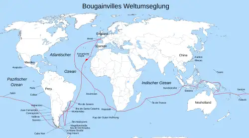 Zu Bougainvilles Weltumseglung gehörten die Fregatte Boudeuse und der Fleute Étoile, ein Versorgungsschiff. Am 1. November 1766 traf Bougainville in Begleitung des Prinzen von Nassau-Siegen in Nantes ein. Vier Tage später begaben sie sich auf der Loire über Paimbœuf nach Mindin, wo die Boudeuse auf die Reise vorbereitet wurde. Am 15. November stachen sie von Mindin aus in See.[5] Zwei Tage später gerieten sie in einen heftigen Sturm, bei dem unter anderem der Hauptmast beschädigt wurde. Bougainville musste daher am 21. November in den Hafen von Brest einlaufen, um Reparaturen vorzunehmen. Zusätzlich zu den Reparaturen wurden einige Umbauten am Schiff vorgenommen. Am 5. Dezember begannen sie mit der Überquerung des Atlantiks.[6][7] Die Étoile verließ am 1. Februar 1767 den Hafen von Rochefort. Mit an Bord waren der Naturforscher Philibert Commerson, dessen als Mann verkleidete Assistentin Jeanne Baret und der Astronom Pierre-Antoine Véron (1736–1770).
