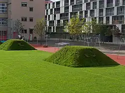 Das als Spielwiese gedachte Rasenfeld lässt ein Stück Ortsgeschichte erkennen: Acht pyramidenförmige Erhebungen stellen die Umkehrform der Munitionslabors der Oerlikon Contraves dar, die früher an dieser Stelle im Boden versenkt waren. Der Allwetterbelag des mit einem Ballfang eingefassten blauen Tartan-Spielfelds erlaubt ganzjährig sportliche Aktivitäten.