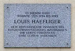 Im September 2003 wurde in Zürich an der Binzmühlestraße der Louis-Häfliger-Park eröffnet.[2] Seit Februar 2006 trägt die Louis-Häfliger-Gasse im Wiener Gemeindebezirk Floridsdorf seinen Namen. Sie führt durch ein ehemaliges Fabrikgelände, in dem sich ab Juli 1944 mit dem Lager „Floridsdorf Hofherr-Schrantz“ ein Teil des Konzentrationslagers Wien-Floridsdorf I befand, das als Außenlager dem KZ Mauthausen zugeordnet war.