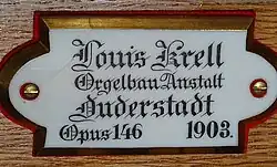 II/P | 34 | 2004 Neubau durch die Werkstatt Orgelbau Krawinkel hinter Krell-Prospekt und unter Einbeziehung einiger vorhandener Register und aus Lagerbeständen von Krell, restliche Register nach Krell rekonstruiert[5] |