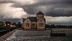 1879 wurde das Cresent Hill Reservoir⊙ in Betrieb genommen, das nicht nur als Wasserspeicher, sondern auch als Absetzbecken für Schlamm und Sand diente. Das Gebäude, in dem sich die Klappen zur Regulierung des Wasserflusses befanden, das sogenannte Gatehouse, wurde im neugotischen Stil nach dem Vorbild eines Gebäudes am Rhein errichtet, das Charles Hermany, der damalige Chefingenieur des Wasserwerks, auf einer Reise nach Deutschland gesehen hatte.[7] In den 1880er Jahren begann Hermany mit Sandfiltern für die Trinkwasseraufbereitung zu experimentieren, zunächst ohne Erfolg. Die Filter neigten bei geringer Fließgeschwindigkeit zum Verstopfen und hatten eine zu geringe Durchflussmenge. Erst Versuche mit höherer Fließgeschwindigkeit, die George W. Fuller im Auftrag des Wasserwerks durchführte, brachten den gewünschten Erfolg.
