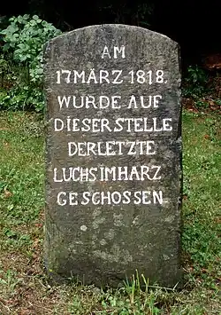 An den letzten freilebenden Wolf, der von Graf Ferdinand zu Stolberg-Wernigerode erlegt wurde, erinnert hingegen der Ferdinandsstein in der Nähe der Plessenburg bei Ilsenburg.
