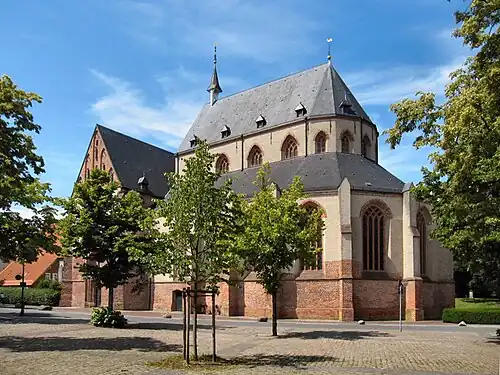 Es folgen das Querhaus (1445 wiederaufgebaut und dabei vergrößert) mit einer Breite von rund 32 Metern und einer Länge von etwa 12 Metern sowie der gotische Chor (um 1455 fertig geworden). Die beiden Querarme verfügen an der westlichen und an der Giebelseite über je ein großes spitzbogiges Fenster mit Maßwerk. An der Ostseite schließt sich der eingerückte Umgang des Chors an. Das nördliche Querhaus weist nur im Sockelbereich Backstein auf, ist ansonsten aber mit hellem Tuffstein aufgeführt und im Giebeldreieck mit drei spitzbogigen Blenden verziert. Die unterschiedlichen Baumaterialien an der südlichen Giebelseite unterstreichen die Gliederung in drei Ebenen: Das untere Drittel besteht wie das Giebeldreieck aus roten Backsteinen, während der mittlere Bereich mit dem Maßwerkfenster aus Tuffstein gebildet ist. Das südliche Giebeldreieck wird von fünf schmalen Blendnischen verziert, in denen Sandsteinstatuetten auf Konsolen stehen. Beide Giebelseiten werden durch reich profilierte korbbogige Portale geprägt, über denen Blendnischen mit profilierten Spitzbogen angebracht sind.[19]