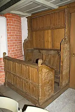 Das Gestühl und die Emporen wurden erst nach der Reformation eingebaut. Die Türchen des ebenerdigen Kastengestühls sind vereinzelt noch mit Wappen, Hausmarken, Monogrammen und Jahreszahlen versehen, die vom einstigen Privatbesitz zeugen. Die geschlossene, schlichte und nur an den Rückenlehnen mit Reihen von gedrechselten Holzstäben verzierte Bauweise sorgte in früheren Zeiten dafür, die Wärme einfacher Fußwärmer, in denen ein Stück Torf glühte, zu halten. Um 1690 wurde das Sitzplatzangebot durch den Bau der großen Emporen im Langschiff erweitert.[29]