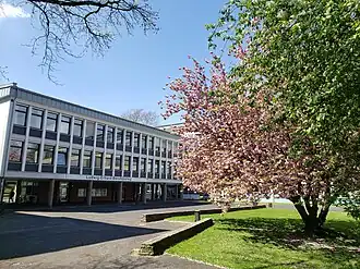 Das vierstöckige, zum Teil fünfstöckige Schulgebäude mit zurückgesetztem Dachgeschoss besteht aus zwei parallel zueinander versetzten Baukörpern, die durch einen niedrigeren Quertrakt inkl. dem Haupteingang verbunden sind. Das Erdgeschoss ist als offene verglaste Halle ausgebildet. Es besteht eine markante Knickung des südwestlichen Flügels aus der Hauptachse der Anlage. Die Grünanlagen dienen auch als Spielplatz und werden nördlich des Gebäudes vom Rheindorfer Bach (auch Mondorfer Bach) gesäumt.