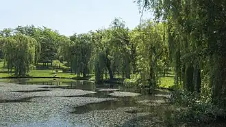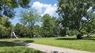 Neben dem Laaerbergbad befindet sich steil abfallend am Südhang des Laaer Berges der große Volkspark Laaerberg, der als Teil des südlichen Wiener Wald- und Wiesengürtels ab dem Jahr 1932 und im Zuge des Badbaues besonders bis 1959 angelegt wurde. Der naturnahe Park besitzt in seiner Mitte den großen Volksparkteich. Im Gelände liegen Kinderspielplätze und eine öffentliche WC-Anlage. In der Nähe des Teichs steht ein Obelisk von Helmut Leherb mit Reliefschmuck auf zwei Seiten, der Tag und Nacht symbolisiert.